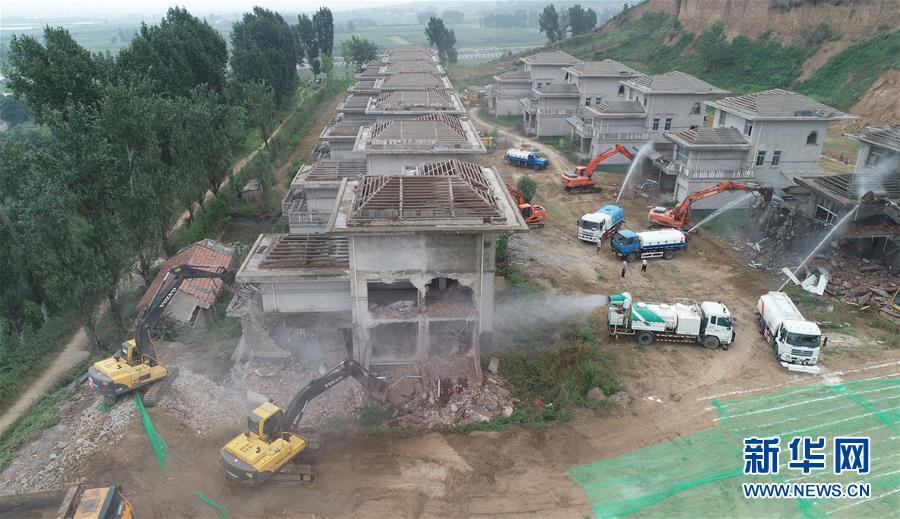 8月14日,大型機(jī)械對(duì)西安市鄠邑區(qū)蔣村鎮(zhèn)的違建別墅進(jìn)行拆除(無(wú)人機(jī)拍攝)。新華社記者 邵瑞 攝