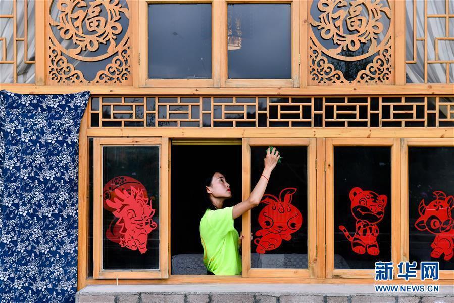 在寧夏固原市西吉縣吉強(qiáng)鎮(zhèn)龍王壩村,一名服務(wù)員在“窯洞賓館”擦玻璃(8月30日攝)。
