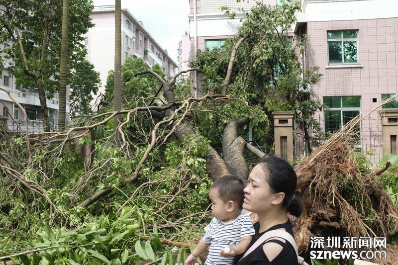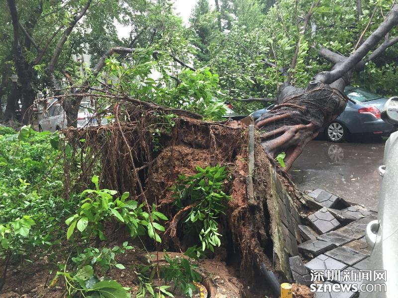 在蓮花北村靠近北環(huán)中學(xué)的小路,記者注意到拉起警戒線,有多株樹木經(jīng)不住大風(fēng)考驗(yàn),已投降就地倒下。