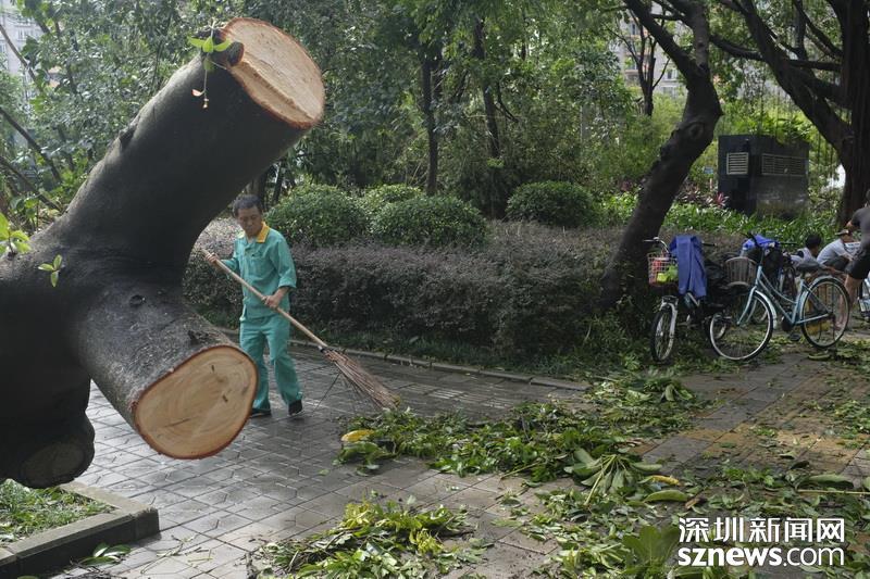 蓮花路新洲路口,有工作人員正在清理道路中伏倒的樹木