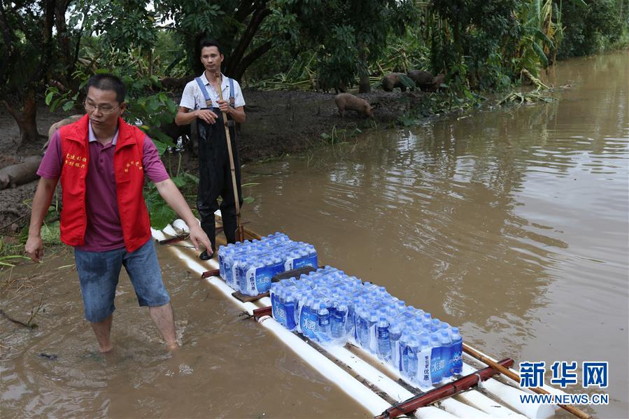9月18日,在廣東省陽江市陽春市,人們用筏子運(yùn)送飲用水。 新華社記者張加揚(yáng)攝