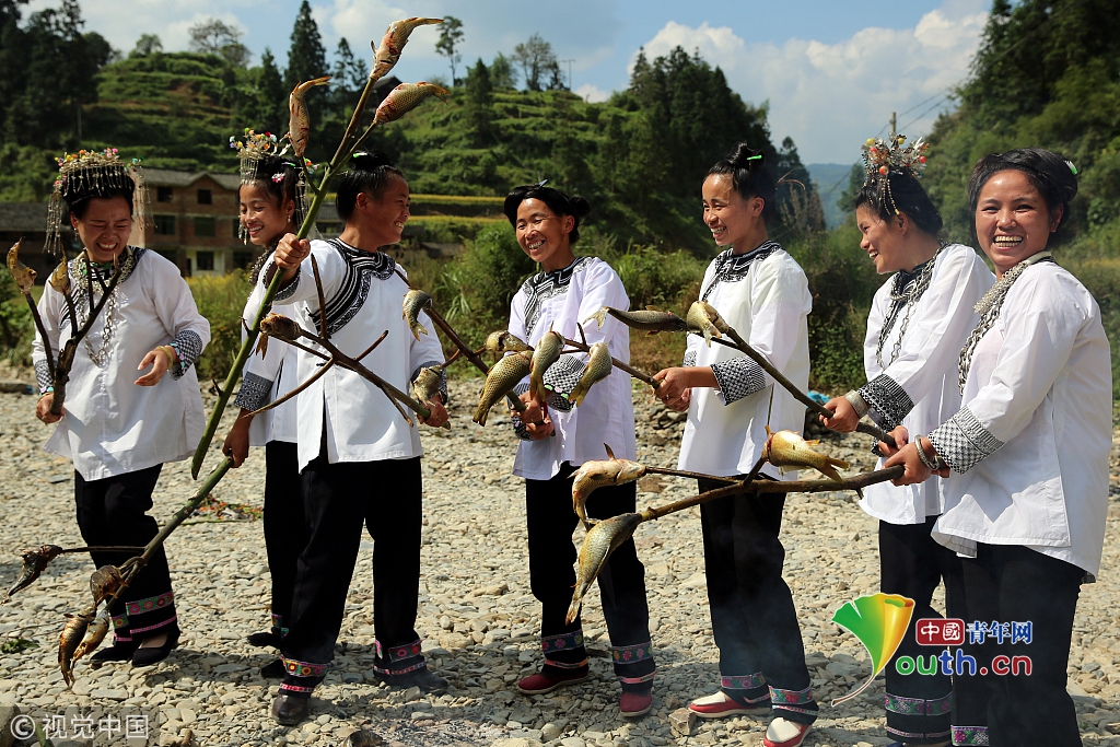 2016年9月17日,貴州省榕江縣平陽鄉(xiāng)硐里村七位侗家婦女們正燒魚。每年中秋時節(jié),當?shù)囟弊逋_田放水,捉魚,全寨男女老少,野外生起篝火烤魚,用烤魚、米酒等,祭祀魚神,祈禱魚糧豐收的傳統(tǒng)民俗活動。