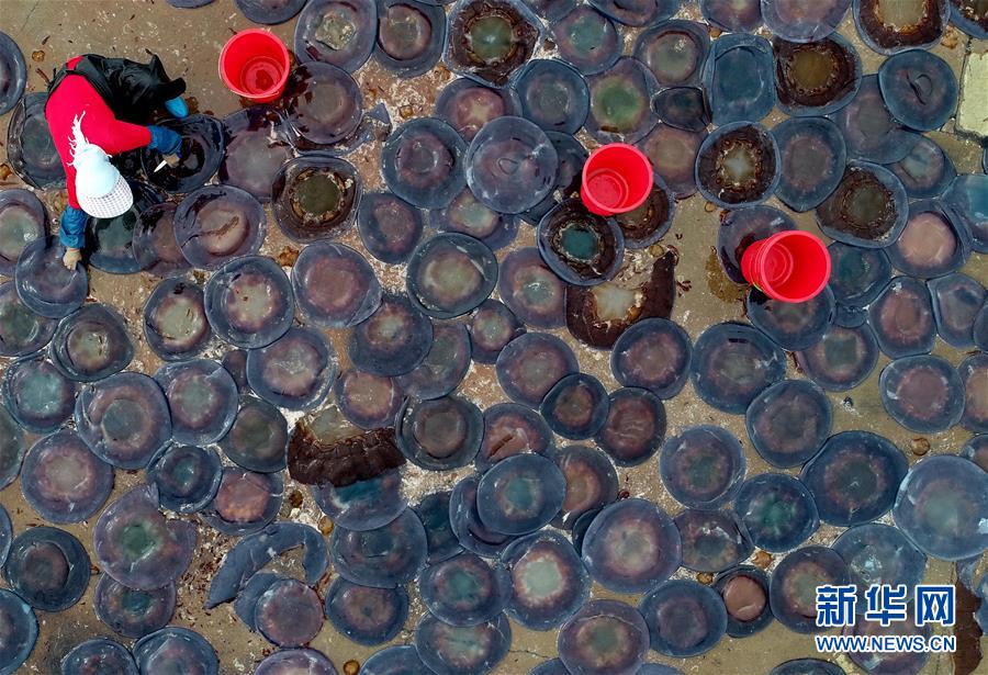 9月21日,灤南縣南堡鎮(zhèn)南堡二村一家海蜇養(yǎng)殖場(chǎng)的工人在海蜇鹵制池內(nèi)擺放海蜇(無(wú)人機(jī)拍攝)。新華社記者楊世堯攝