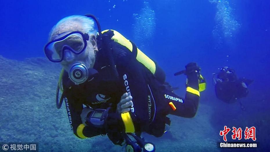 當(dāng)?shù)貢r(shí)間2018年9月1日,塞浦路斯,95歲的英國潛水員雷·伍利(Ray Woolley)以44分鐘下潛40.5米的成績打破了自己94歲達(dá)成的記錄(41分鐘下潛38.1米),二度刷新了世界上年齡最大的男性潛水員最好成績。在此次下潛中,這位二戰(zhàn)退伍老兵對距塞浦路斯南部城鎮(zhèn)拉納卡約2公里處的海域進(jìn)行了探索,1980年一艘名為“芝諾比亞號”(Zenobia)的貨船在這里進(jìn)行首次航行時(shí)沉沒。圖片來源:視覺中國