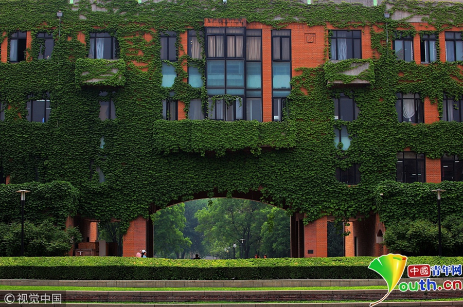 2018年5月10日,北京。在清華校園內(nèi)教學樓、辦公樓等多處建筑物上被爬山虎攀爬扮綠,呈現(xiàn)一派綠裝素裹自然美麗景觀。