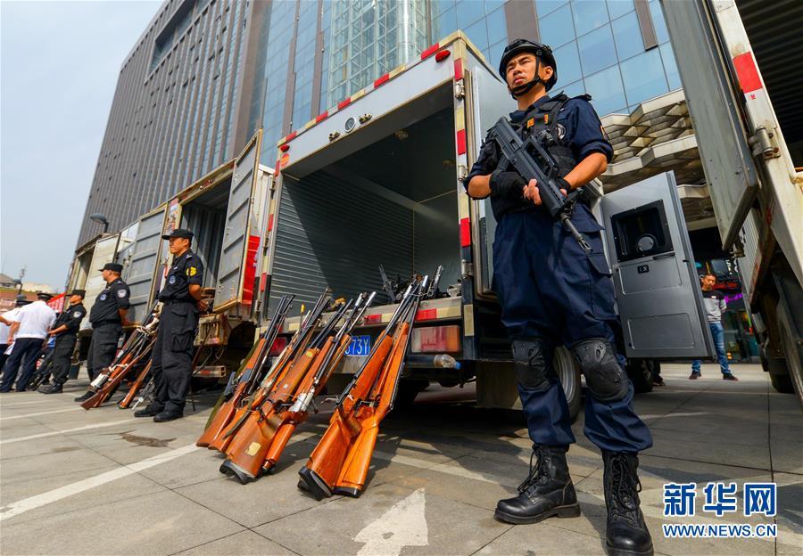 9月20日,在河北省邯鄲市天鴻廣場(chǎng),警方展示即將銷毀的非法槍支。 新華社記者 王曉 攝