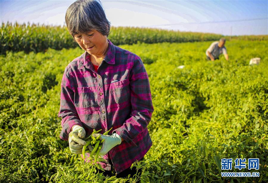 9月28日,饒陽縣留楚鄉(xiāng)影林村的種植戶在摘辣椒。 近年來,河北省饒陽縣結(jié)合市場需求,積極引進特色品種辣椒種植,開辟出一條農(nóng)民增收致富新路。目前,該縣特色辣椒種植面積1000余畝,種植戶年均增收3000余元。 新華社記者 李曉果攝