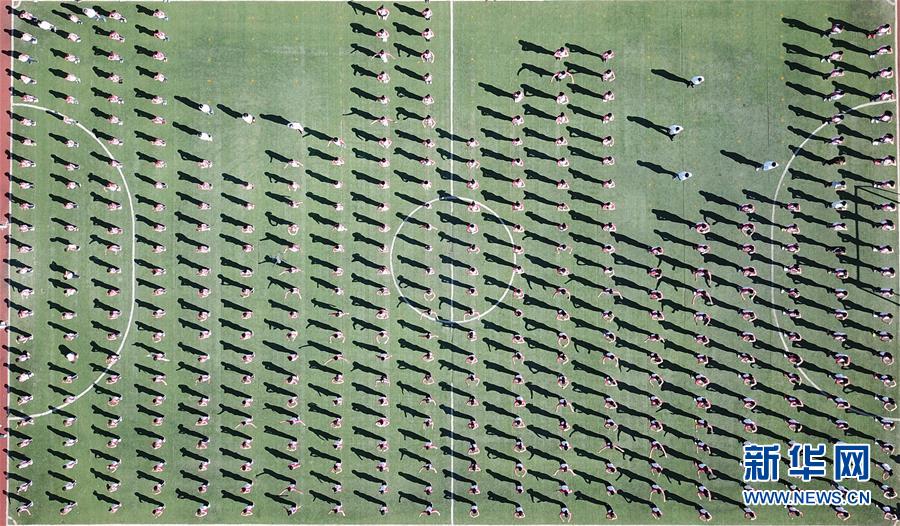 在小崗村小崗學校,學生們在體育展示課上做操(9月27日無人機拍攝)。  新華社記者 才揚攝