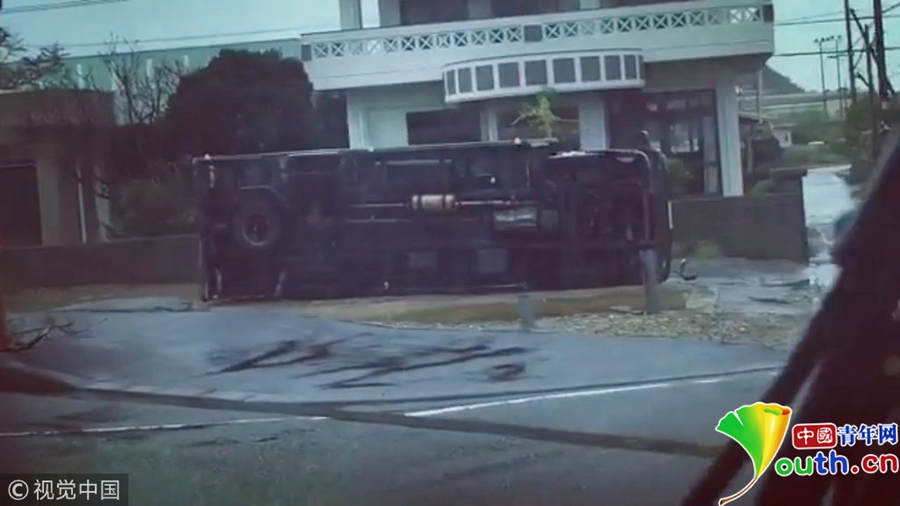 一輛大巴車被掀翻在地。