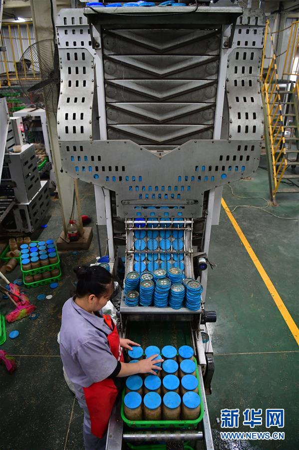 在位于清豐縣的河南龍豐實業(yè)股份有限公司,一名工人在裝瓶車間查看食用菌栽培瓶裝瓶情況(9月28日攝)。新華社記者馮大鵬攝