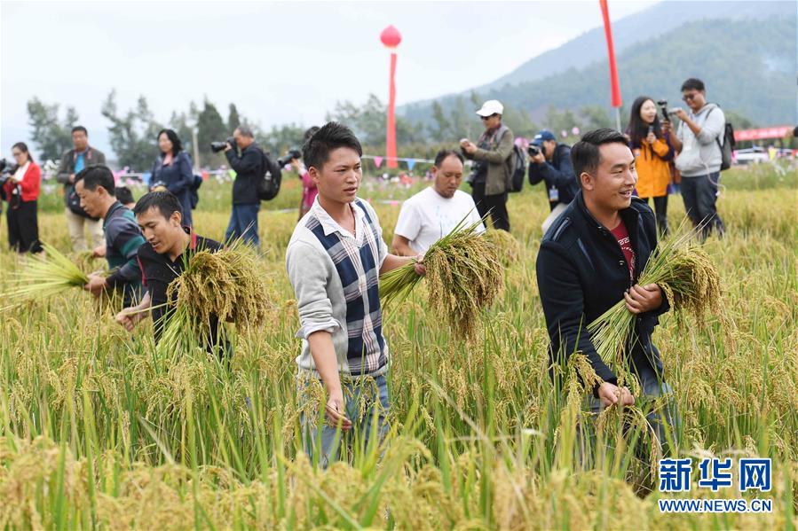 9月29日,人們參加拔谷穗比賽。9月29日,云南省尋甸回族彝族自治縣2018年首屆農(nóng)民豐收節(jié)暨第二屆摸魚(yú)節(jié)在雞街鎮(zhèn)舉行,當(dāng)?shù)剞r(nóng)民和游客在豐收的稻田里進(jìn)行摸魚(yú)、拔谷穗、山歌對(duì)唱等活動(dòng),享受收獲的喜悅。新華社記者楊宗友攝