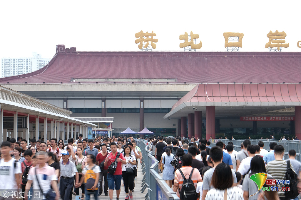 2018年10月1日國(guó)慶節(jié),珠海拱北口岸迎來(lái)第一波過(guò)關(guān)的民眾,拱北口岸是中國(guó)人流量最大的陸地通關(guān)口岸。圖片作者:潘力