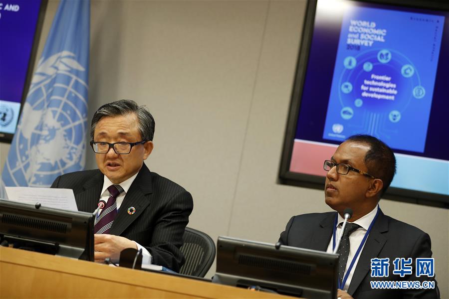 10月8日,在位于紐約的聯(lián)合國總部,聯(lián)合國負(fù)責(zé)經(jīng)濟和社會事務(wù)的副秘書長劉振民(左)向記者介紹《2018年世界經(jīng)濟和社會概覽》。新華社記者李木子攝