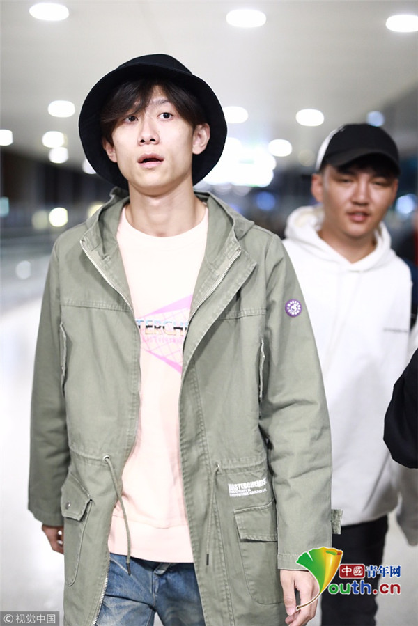 2018年10月14日,上海,張一山抵達(dá)上海機場。張一山戴漁夫帽眼袋嚴(yán)重瞬間老十歲, 用手擋臉?biāo)撇辉干乡R。
