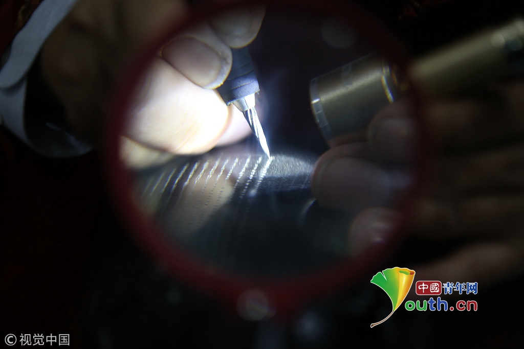 濟南一大爺黑陶鼎上刻字 1個字不到1毫米需用放大鏡看
