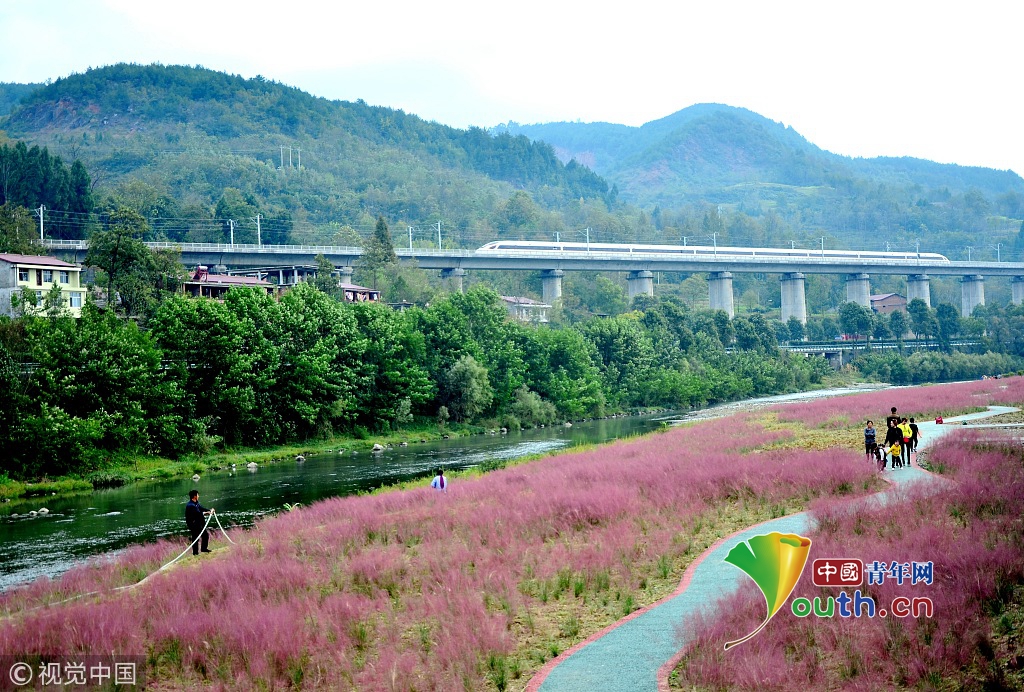 2018年10月14日,陜西漢中,西成高鐵漢中市寧強(qiáng)縣高寨子路段上的一列動(dòng)車(chē)正從紅艷艷的蘆葦花海附近駛過(guò)。