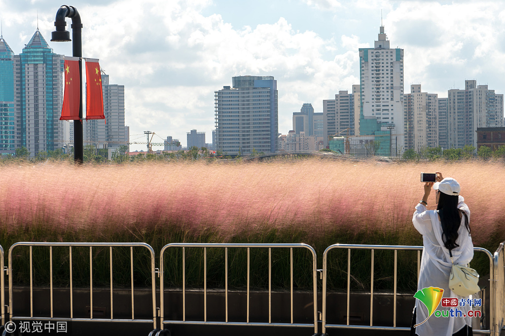 2018年9月28日,上海,東外灘楊浦濱江的粉黛亂子草目前已進(jìn)入盛花期,當(dāng)日早間,不少市民來到濱江拍照賞景,成片的紫色花海在藍(lán)天白云映襯下美不勝收。圖片作者:王岡/視覺中國