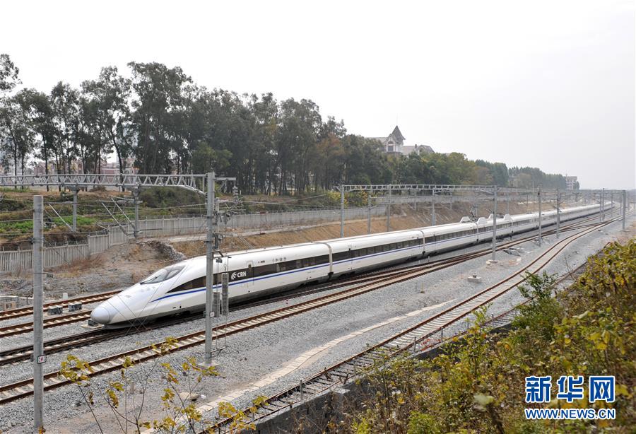 廣西桂林至北京高鐵列車在桂林市靈川縣境內(nèi)行駛(2013年12月28日攝)。 廣西壯族自治區(qū)成立60年來,鐵路建設(shè)發(fā)生翻天覆地的變化。來自中國鐵路南寧局集團(tuán)有限公司的數(shù)據(jù)顯示,1958年廣西鐵路總里程為1346.3公里,如今廣西鐵路總里程達(dá)5191公里。廣西與周邊相鄰省份間實現(xiàn)動車“公交化”開行。此外,北部灣港—重慶班列、東盟海產(chǎn)品冷鏈班列、“百色一號”果蔬專列等的開通和運(yùn)營,強(qiáng)化了鐵路供給的針對性和有效性。鐵路成為助推廣西經(jīng)濟(jì)社會快速發(fā)展的“大動脈”。 新華社記者陸波岸攝