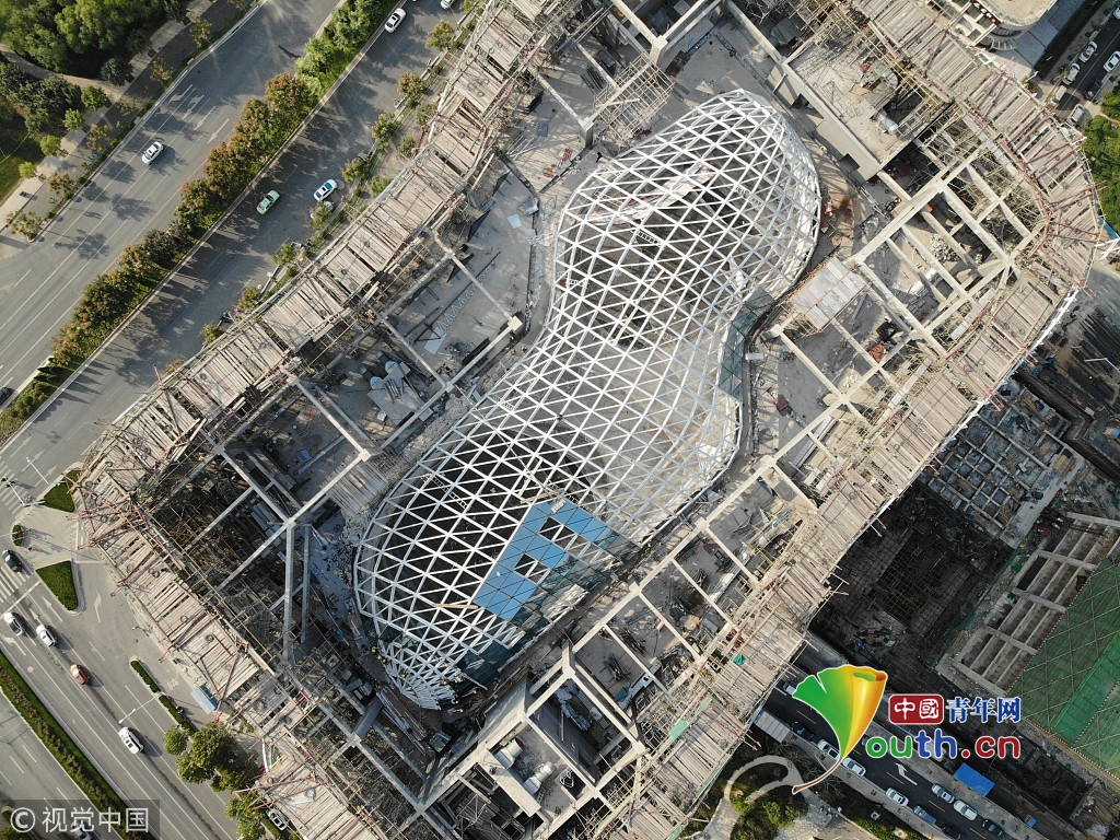 2018年10月13日,河南鄭州,龍子湖湖心島上的一棟在建大樓頂部設(shè)計(jì)為鏤空的框架結(jié)構(gòu),俯瞰酷似一顆巨大的花生。
