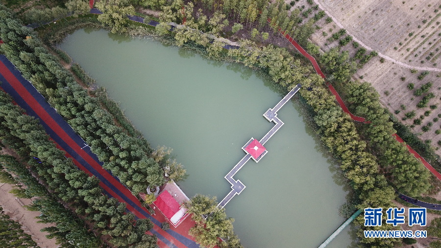 俯瞰恩格貝月亮湖。(新華網(wǎng) 王宇 攝)