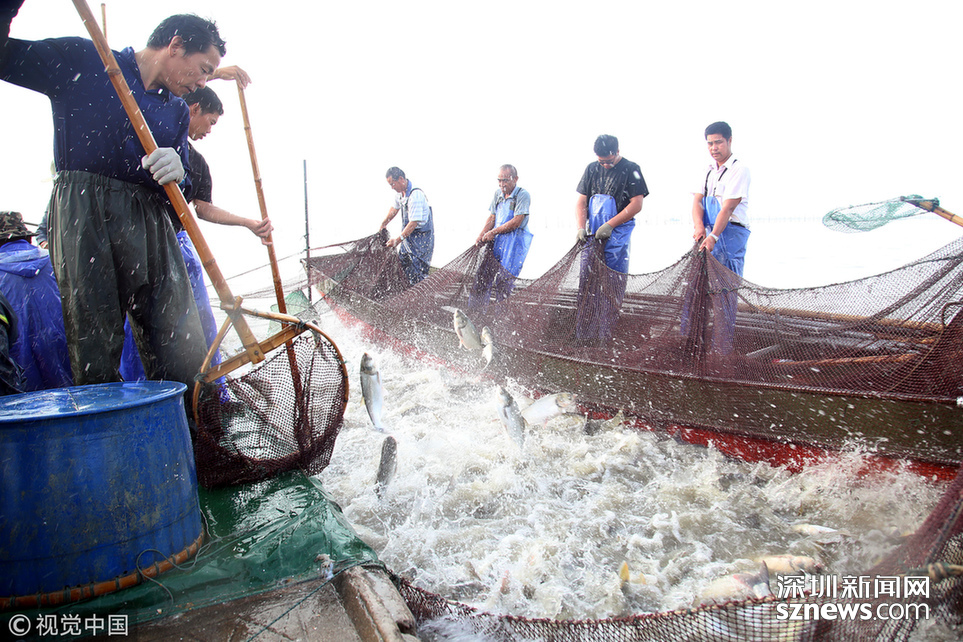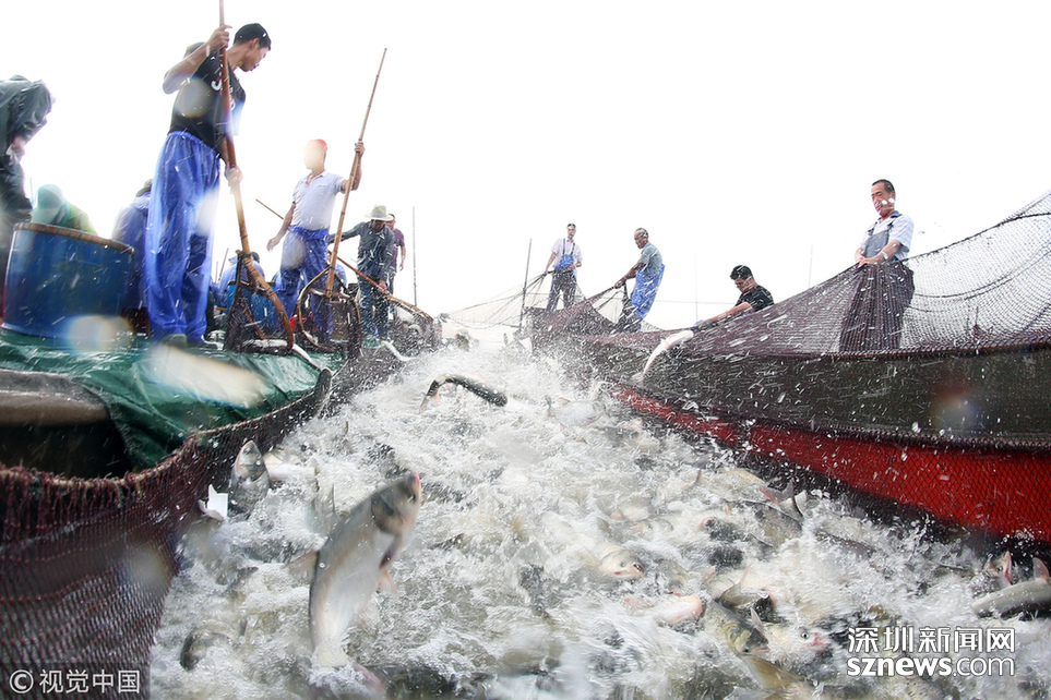 2018年6月26日,江蘇省常州市嘉澤鎮(zhèn)捕撈村的漁民組織夏季捕撈,一網魚達五萬余斤,以鰱魚為主,供應市場需求。夏捕的魚價較平時有所上漲,漁民粗略估計可增收上萬余元。