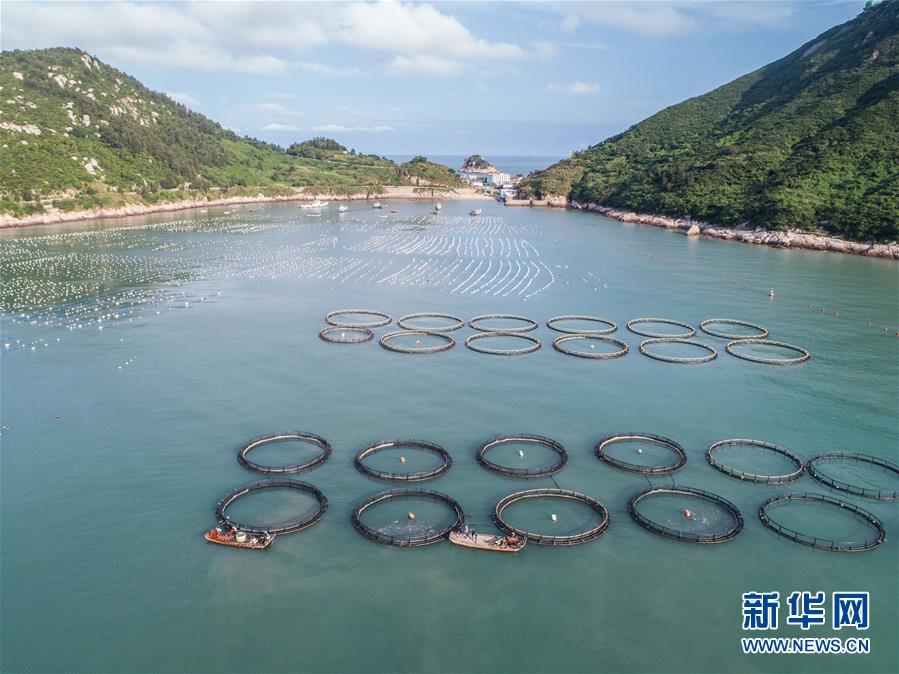 8月18日,南麂島馬祖岙海域的“海上牧場”養(yǎng)殖區(qū)(無人機拍攝)。南麂島位于浙江東南海域,水質好,水溫、鹽度都適合大黃魚等養(yǎng)殖魚類的生長繁殖,因此當?shù)氐乃a品也一直保持了較高的品質和口碑。進入8月,浙江省溫州市平陽縣南麂鎮(zhèn)海域上大片的大黃魚、貽貝等特色海產品養(yǎng)殖區(qū)域迎來豐收季節(jié),養(yǎng)殖戶們駕駛漁船在養(yǎng)殖區(qū)海域進行打撈收獲,在碧海藍天下構成了一幅“海上牧場”的美麗豐收景象。近年來,南麂鎮(zhèn)政府引導漁民養(yǎng)殖戶充分發(fā)揮“靠海吃海”的資源優(yōu)勢,大力發(fā)展海洋養(yǎng)殖經濟和海島旅游經濟,實現(xiàn)了南麂由“生態(tài)美”向“產業(yè)美”,“產業(yè)美”向“經濟美”的轉變。同時該鎮(zhèn)堅持以大黃魚、貽貝等為特色產業(yè)支撐,精準發(fā)展高效海洋養(yǎng)殖業(yè),重點培養(yǎng)一批新型職業(yè)漁民,依靠專業(yè)技術支持,實現(xiàn)深海仿生養(yǎng)殖,讓好生態(tài)造就好品質,重點打造南麂養(yǎng)殖品牌,組建營銷網絡,拓展特色海產品市場。新華社記者 徐昱攝