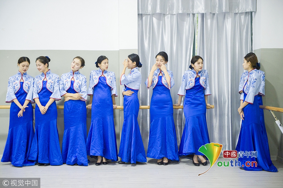 來自浙江傳媒學(xué)院的禮儀志愿者們正在進(jìn)行緊張有序的集中訓(xùn)練。圖片作者:浙江日報(bào) 馮賀/視覺中國