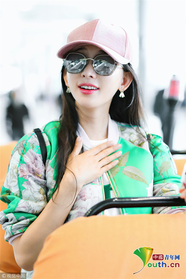 2018年10月16日,上海,林志玲亮相機場,她身穿綠色印花外套搭配粉色鴨舌帽十分清新靚麗,乖乖坐小車抿嘴甜笑比V嘟嘴頻賣萌。
