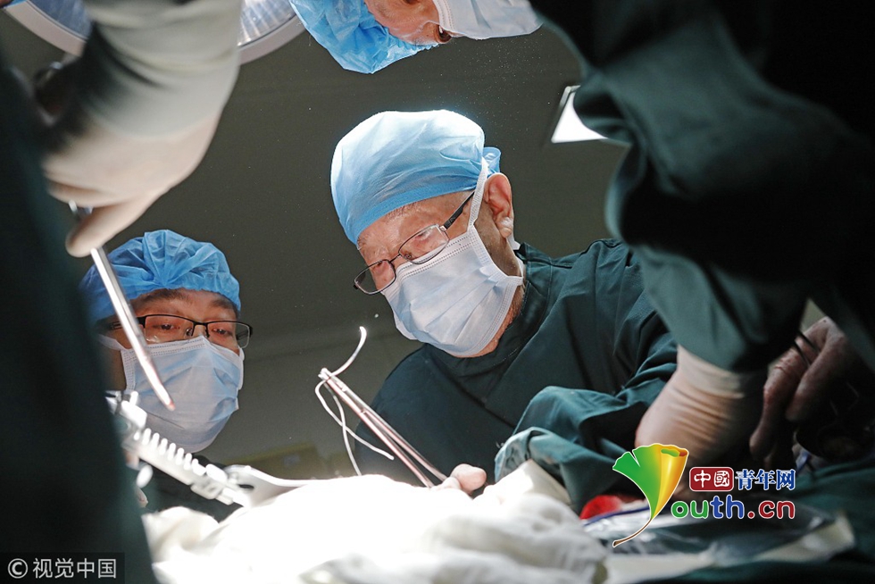 2018年4月13日,在江蘇省徐州市第一人民醫(yī)院手術(shù)室,96歲高齡的“中國肝膽外科之父”、中國科學院院士吳孟超親自為患者進行手術(shù)。當日,吳孟超院士和中國人民解放軍海軍軍醫(yī)大學附屬東方肝膽外科醫(yī)院的醫(yī)療團隊來到江蘇徐州為患者進行手術(shù)。 殷立勤/視覺中國