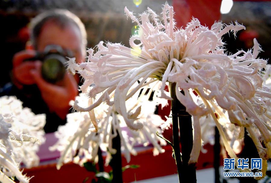 10月17日,游客在開封龍亭公園內(nèi)拍攝展出的菊花。重陽時節(jié),各色菊花競相綻放,把古都開封裝點得分外秀美,吸引眾多游客前來觀賞游玩。 新華社記者 李安 攝