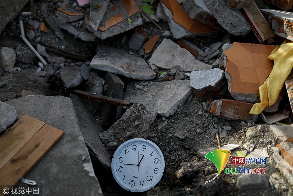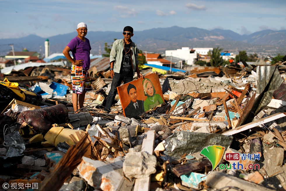 當(dāng)?shù)貢r間2018年10月7日,印尼帕盧,兩名男子從地震廢墟中找回他們?nèi)ナ栏改傅漠嬒?。圖片作者:JORGE SILVA/視覺中國