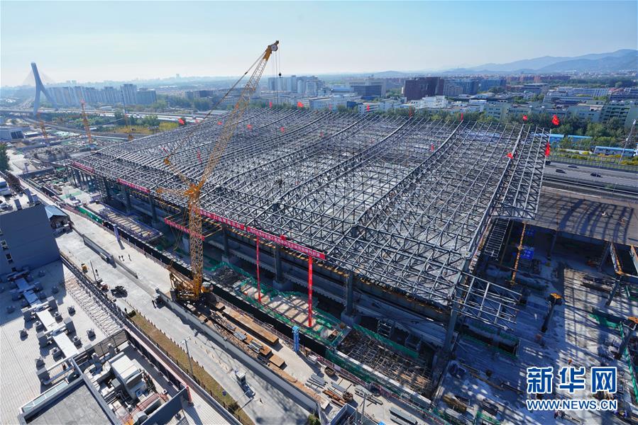 10月17日拍攝的建設(shè)中的清河站。當(dāng)日,京張高鐵新建車站——清河站主體結(jié)構(gòu)正式封頂。清河站是京張高鐵建筑面積最大的車站,同時(shí)也是京張高鐵在北京地區(qū)的始發(fā)站之一。 新華社發(fā)(馮凱 攝)