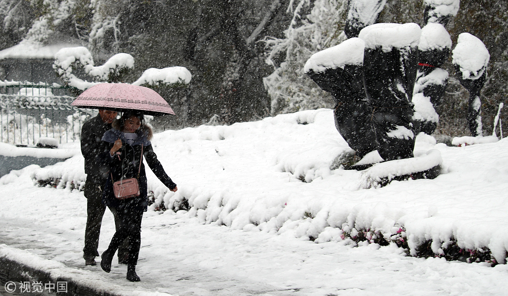 10月18日,行人穿行在烏魯木齊積雪覆蓋的人行道上。當(dāng)日,新疆烏魯木齊迎來一場(chǎng)降雪。 新華社記者 江文耀 攝