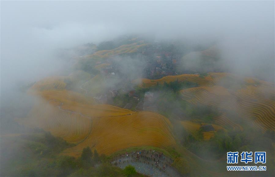 10月16日,游客在秋雨中欣賞龍脊梯田秋色(無人機拍攝)。金秋時節(jié),廣西龍勝各族自治縣龍脊梯田美如畫卷。   新華社記者 黃孝邦 攝