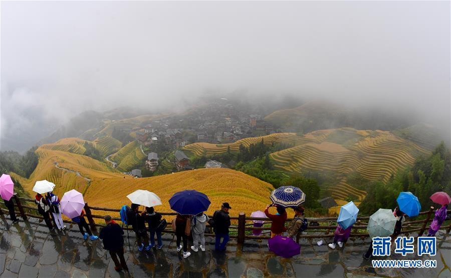 10月16日,游客在秋雨中欣賞龍脊梯田秋色。金秋時節(jié),廣西龍勝各族自治縣龍脊梯田美如畫卷。   新華社記者 黃孝邦 攝