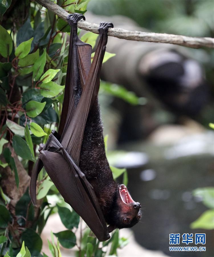 10月18日在廣州長隆野生動物世界拍攝的馬來大狐蝠。 當日,馬來大狐蝠在廣州長隆野生動物世界首次展出。馬來大狐蝠體長20至25厘米,翼幅最大近兩米,主要分布在印度尼西亞與馬來西亞等地。 新華社記者 黃國保 攝