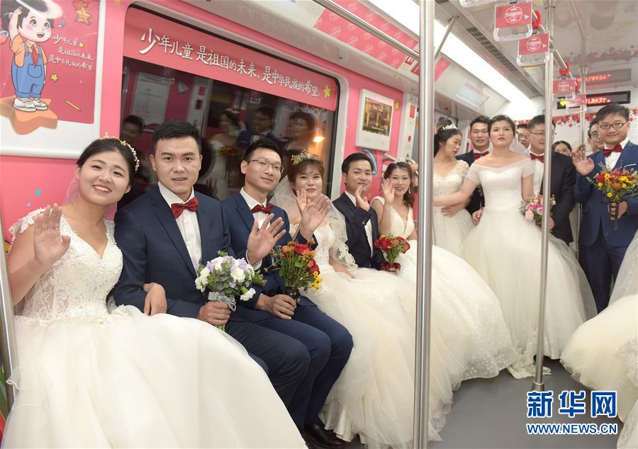 10月18日,在合肥市地鐵一號線車廂內(nèi),新人們合影留念。 當(dāng)日,中鐵四局集團(tuán)城市軌道交通工程分公司的18對新人在安徽合肥地鐵一號線的車廂里舉行了一場集體婚禮儀式。 新華社記者 郭晨 攝