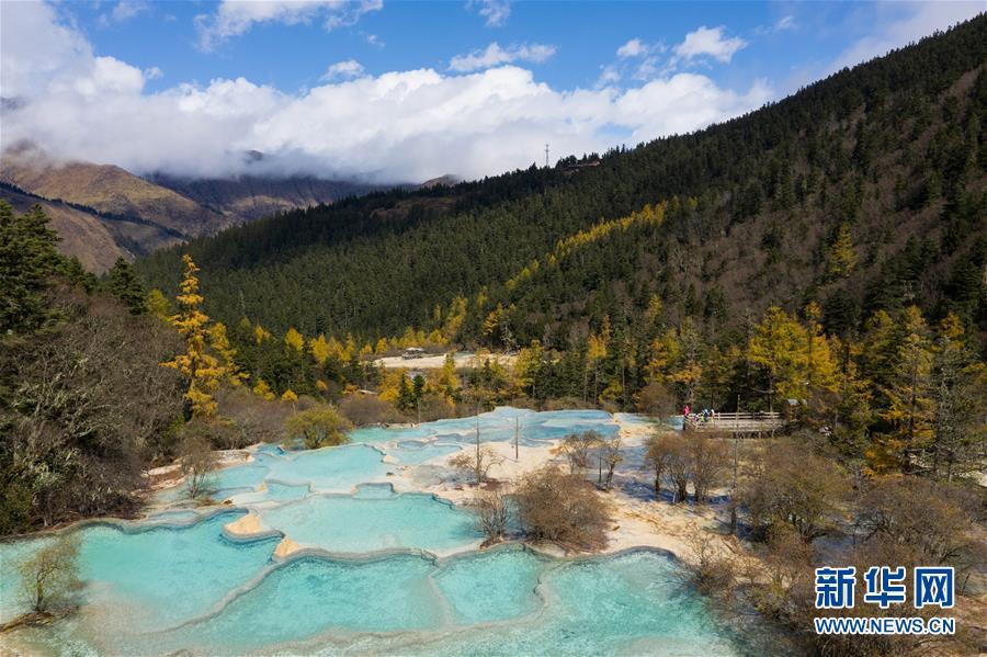 藍天白云與彩林、彩池構成一幅美麗畫卷(10月19日無人機拍攝)。深秋時節(jié),在雪山、藍天、白云和彩林映襯下,黃龍溝中的彩池色彩更加斑斕,目前黃龍景區(qū)進入觀賞最佳時節(jié)。黃龍風景名勝區(qū)位于四川省松潘縣境內,以彩池、灘流、雪山、峽谷、森林等聞名,享有“人間瑤池”“圣地仙境”之美譽。新華社記者 江宏景攝