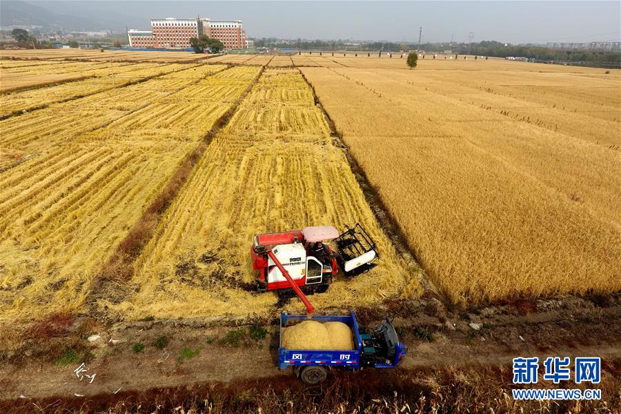 在太原市晉源區(qū)赤橋村,收割機(jī)在稻田里作業(yè)(10月17日無人機(jī)拍攝)。近日,山西省太原市晉源區(qū)2000多畝水稻迎來收割季。 金秋時(shí)節(jié),農(nóng)民們忙著收獲成熟的農(nóng)作物,喜迎豐收。 新華社記者 詹彥 攝