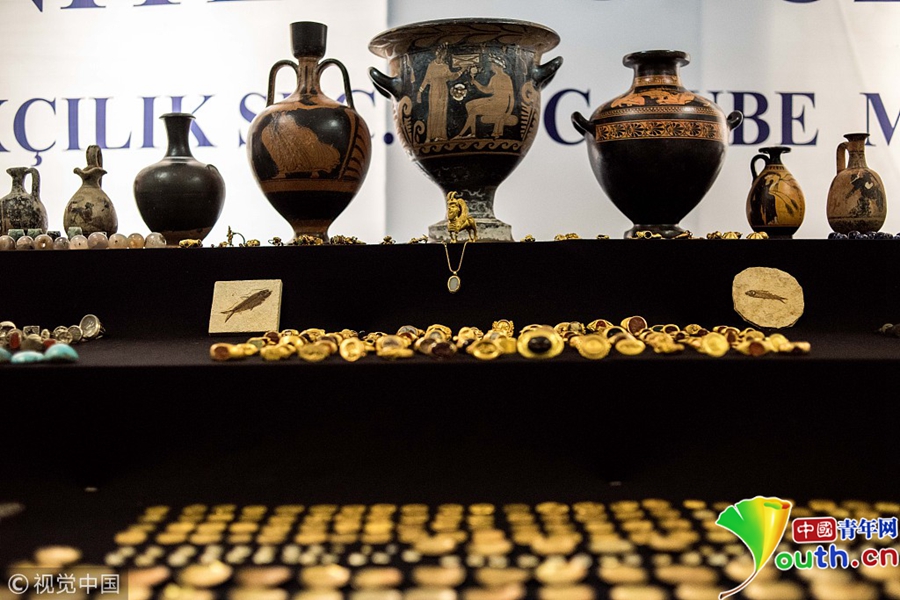 中國青年網北京10月21日電 當?shù)貢r間2018年10月19日,土耳其伊斯坦布爾,繳獲的走私文物在伊斯坦布爾展出。以伊斯坦布爾為主的安全委員會展開打擊文物走私行動,取得歷史性收獲,在全國12個省份繳獲了攻擊1.4萬件文物,其中包括金幣、羅馬時期的墓碑、呂底亞銀幣、拜占庭硬幣以及羅馬時期的劍等。圖片來源:視覺中國