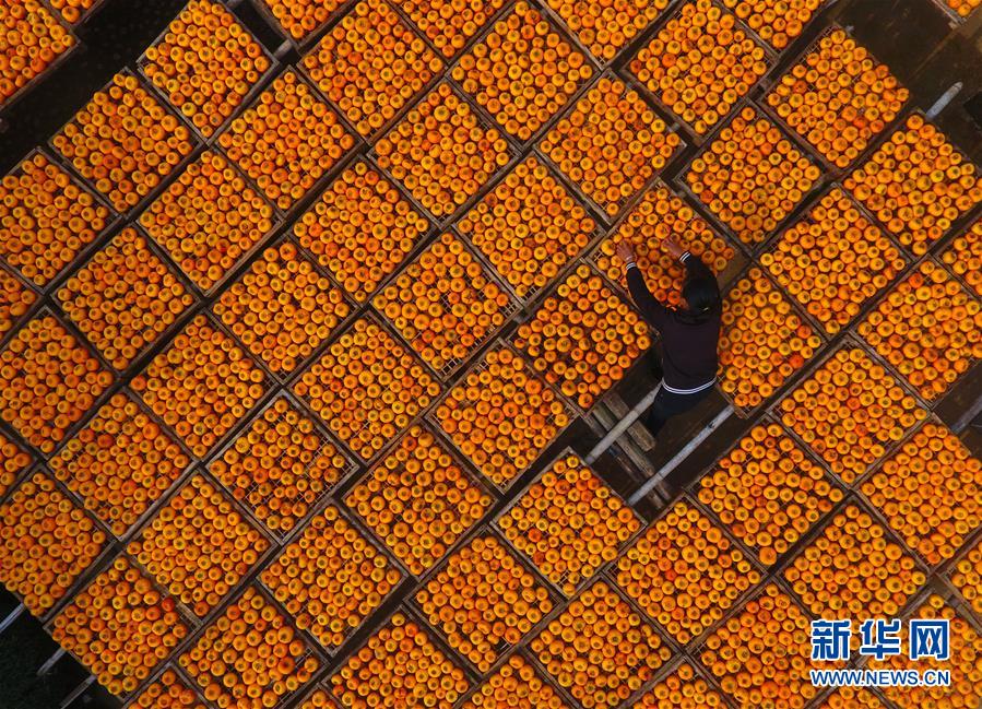 10月17日,廣西桂林市平樂縣沙子鎮(zhèn)渡河村農(nóng)民在晾曬柿子(無人機拍攝)。 金秋時節(jié),農(nóng)民們忙著收獲成熟的農(nóng)作物,喜迎豐收。 新華社記者 黃孝邦 攝