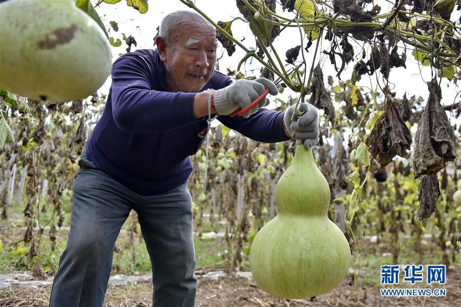9月27日,山西省安澤縣和川鎮(zhèn)孔旺村的村民在摘葫蘆。近日,山西省安澤縣和川鎮(zhèn)孔旺村種植的葫蘆喜獲豐收,村民們忙著將摘下的葫蘆去皮晾干??淄逵?016年成立葫蘆種植合作社,種植、采摘、加工等環(huán)節(jié)全部由貧困戶負(fù)責(zé),為貧困戶拓寬增收渠道。新華社記者 曹陽(yáng) 攝