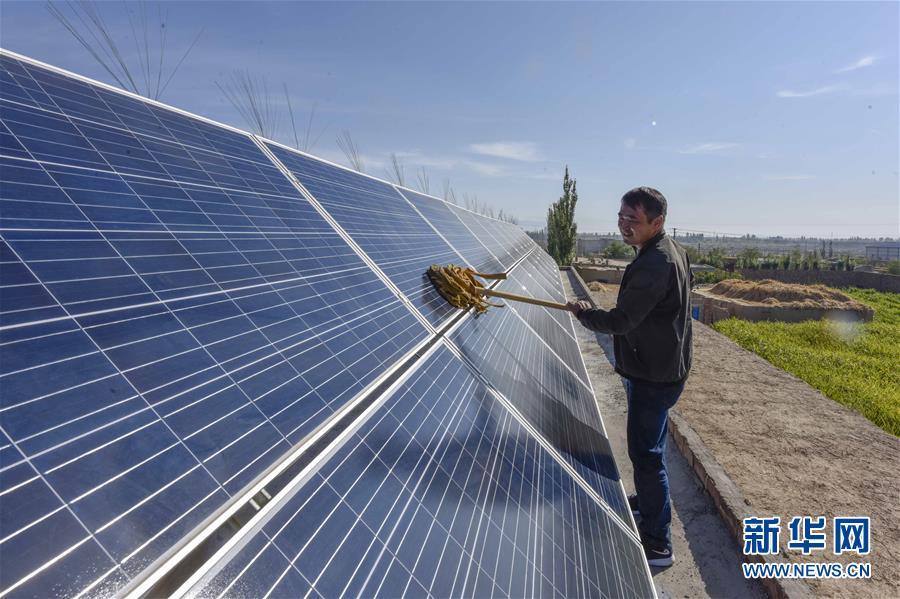 在新疆哈密市伊州區(qū)回城鄉(xiāng)鐵木爾提村,村民潘林琪打掃自家房頂上的太陽能發(fā)電板(2018年9月21日攝)。今年以來,新疆穩(wěn)步推進新能源參與“疆電外送”、擴大與燃煤自備電廠調(diào)峰替代交易等多種電力交易方式,著力破解“綠色電力”上網(wǎng)難題,新能源發(fā)電量同比增加近13個百分點,而棄電量和棄電比實現(xiàn)“雙降”,綠色發(fā)展理念進一步落實。新疆是我國重要的能源供應(yīng)和儲備基地,風能、太陽能儲量豐富。近年來,新疆新能源裝機總量突破2700萬千瓦,規(guī)模和占比均居全國前列。新華社記者 趙戈 攝