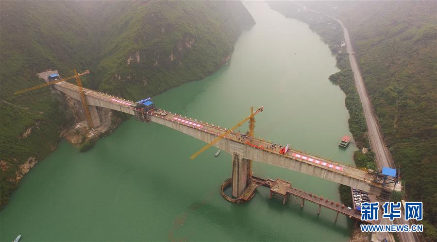 在重慶涪陵拍攝的渝懷鐵路涪秀二線重點工程——烏江右線大橋(10月23日無人機拍攝)。 10月23日,由中鐵四局承建的渝懷鐵路涪秀二線重點工程——烏江右線大橋主跨成功合龍,標志著大橋主體工程全部順利結束。烏江右線大橋項目全程460.1米,主跨192米,跨越烏江和319國道。在兩年多的建設過程中,施工人員攻克了“不等高墩”“不對稱邊跨”“邊跨入隧”等多個技術難題。 新華社記者王全超攝