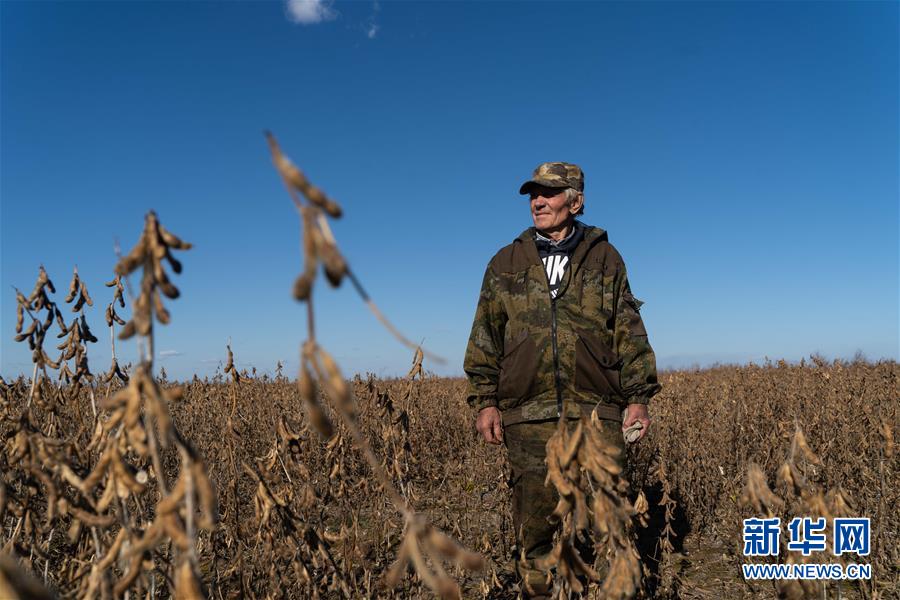 村民在俄羅斯猶太自治州比羅比詹市附近的大豆農(nóng)場(chǎng)里勞作(10月19日攝)。新華社記者張若玄攝