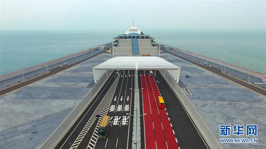 10月24日,來往車輛在東人工島上出入海底隧道(無人機拍攝)。 當日,港珠澳大橋正式通車。