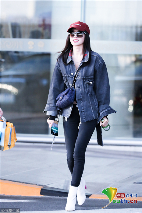 2018年10月24日,北京,“富察皇后”秦嵐現(xiàn)身機(jī)場。她頭戴小紅帽,身穿黑色緊身褲顯美腿筆直修長,上身穿著牛仔外套青春逼人,邊走邊甜笑玩“撩發(fā)殺”,靚麗吸睛。