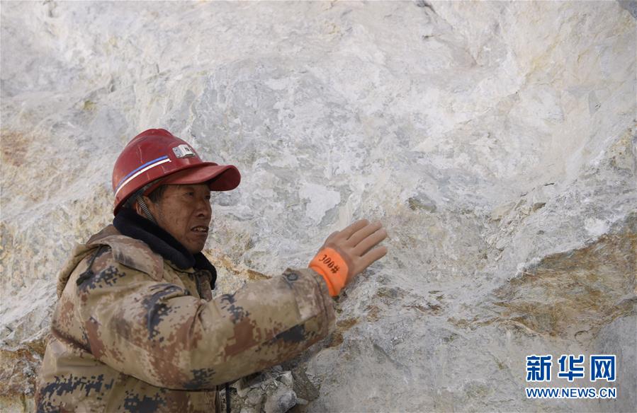 在昆侖山上海拔4000米的興發(fā)達(dá)玉礦,工程師田仲祥展示一塊正在開采的玉石礦體(10月23日攝)。  新華社記者武巍攝
