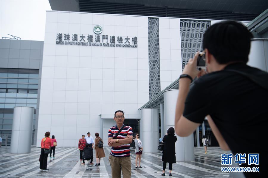 10月24日,市民在港珠澳大橋澳門邊檢大樓外拍照留念。 當(dāng)日,港珠澳大橋正式通車。