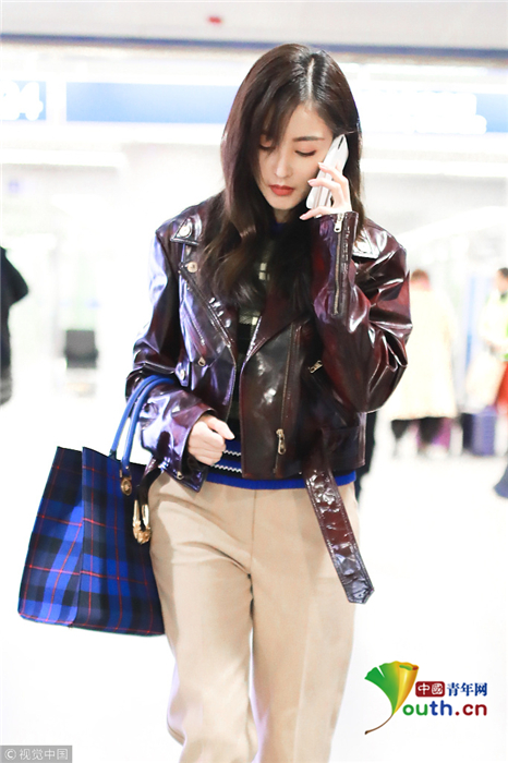 2018年10月25日,北京,張?zhí)鞇郜F(xiàn)身機場,她身穿短款漆皮夾克時尚帥氣,低頭疾走打電話星范十足。